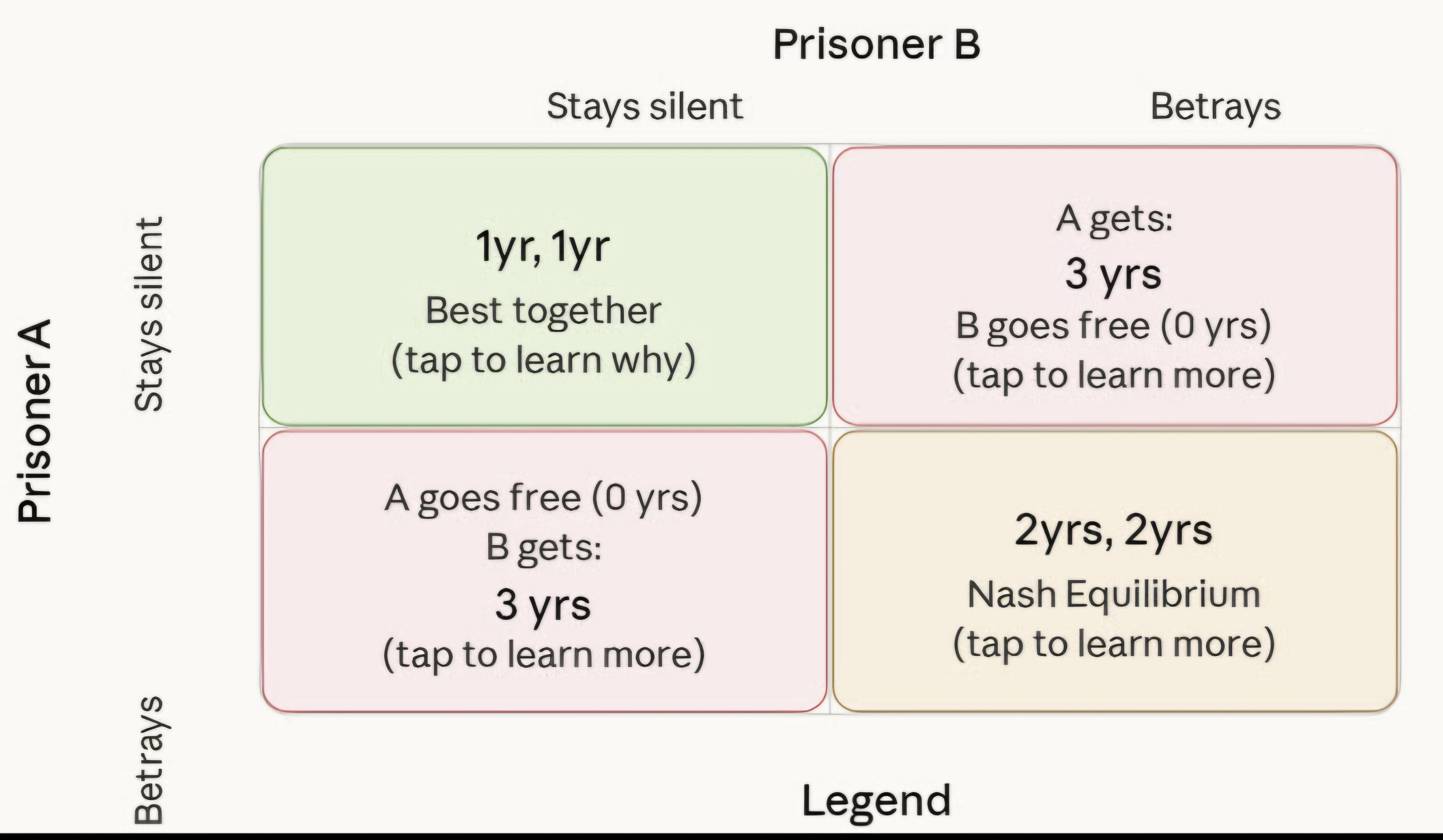 One of the most famous examples of the subject is “The Prisoner’s Dilemma”. Imagine two suspects are arrested and held in the tank separately. Furthermore, assume they can’t contact each other whatsoever. Each one is offered a deal (option 1) betray the other or (option 2) stay silent. The twist is that what's best for each individual leads to a worse outcome for both of them together.